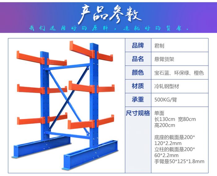1、懸臂貨架系列全部采用組合式,拆裝,運輸,調節(jié),移動等簡易方便,安全可靠