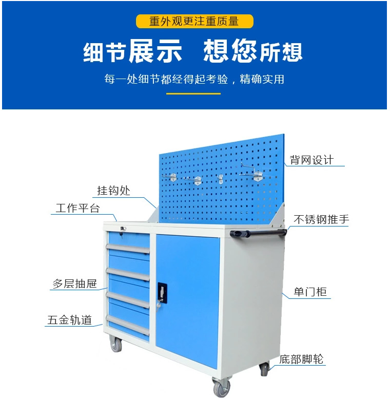 掛板工具車采用單軌設(shè)計(jì),抽屜內(nèi)可配置隔片或者料盒使用, 取用方便。