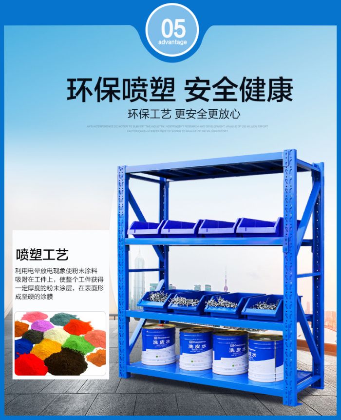 5、貨架各部件加工好成型之后全部經(jīng)打磨、酸洗、磷化、全自動粉末靜電噴涂、烘干等工藝處理后組裝成品。生產(chǎn)出的貨架成品表面光潔、美觀;貨架層可上下依50mm節(jié)