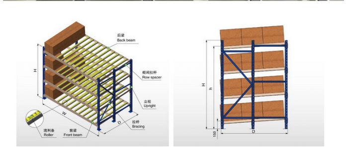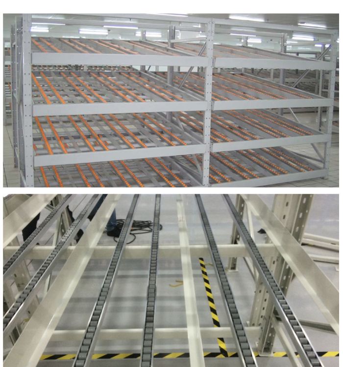 1、采用滾輪式鋁合金等流力條,利用貨物自重實(shí)現(xiàn)貨的先進(jìn)先出。