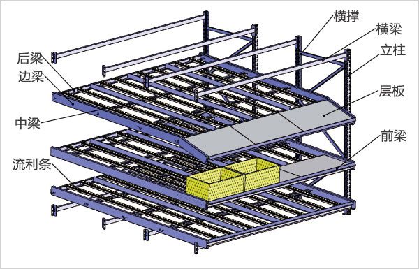 流利式貨架結構特點:流利式貨架的流利條直接連接到前后橫梁及中間支撐梁上,橫梁直接掛在支柱上,流利條安裝傾斜度取決于貨箱的尺寸、重量以及流利架的深度,通常取5%~9%。流利條滾輪的承載力為6kg/只,當貨物較重時,可以在一個滾道安裝3-4根流利條。通常在深度方向上每隔0.6m安裝一根支撐梁以增加流利條的剛度。當滾道較長時,可用分隔板將滾道隔開。取貨端需安裝制動片使貨物減速,降低沖擊。
